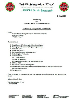 Die Jahreshauptversammlung des TuS Wichlinghofen 77 e. V. findet am Sonntag, 12.04.2026 um 14:00 Uhr in der Gaststätte des Kleingartenverein Ruhrwaldstraße e.V., Brandisstraße 180, 44265 Dortmund, statt.